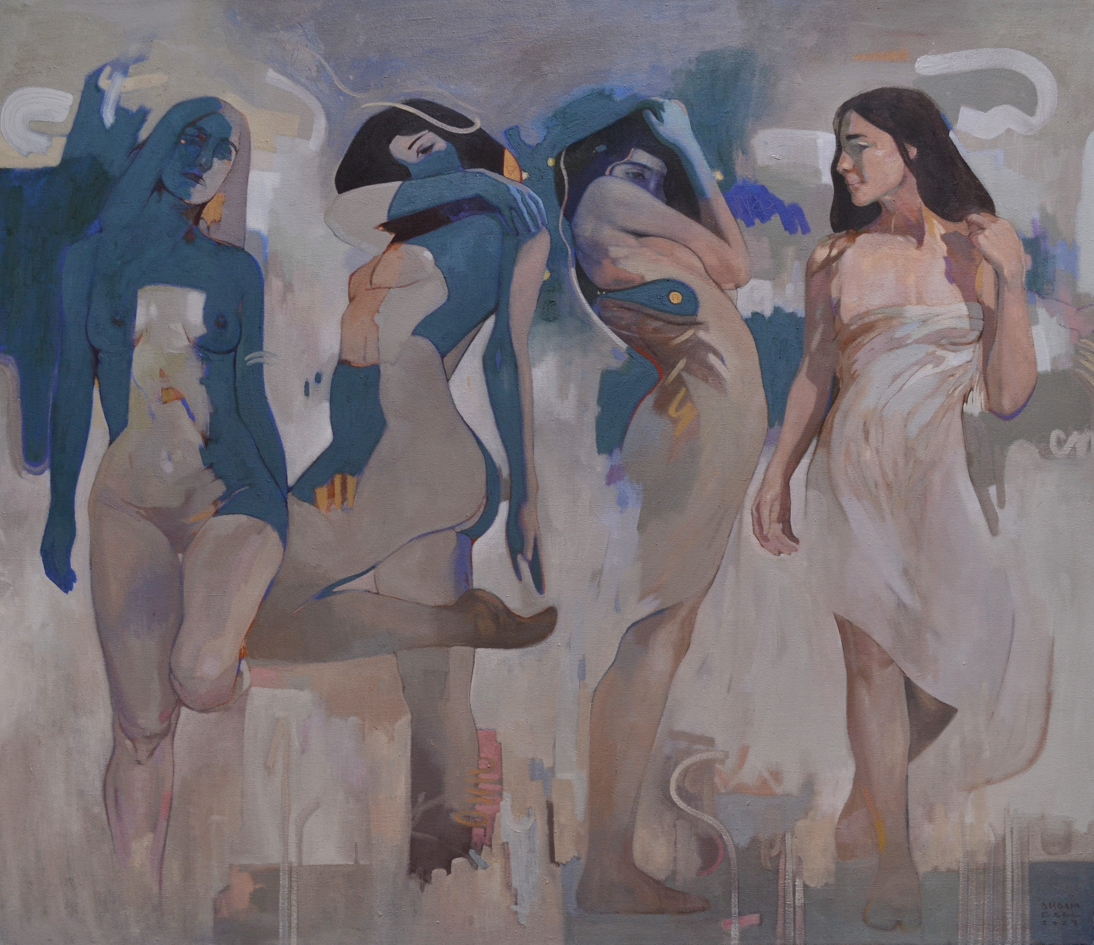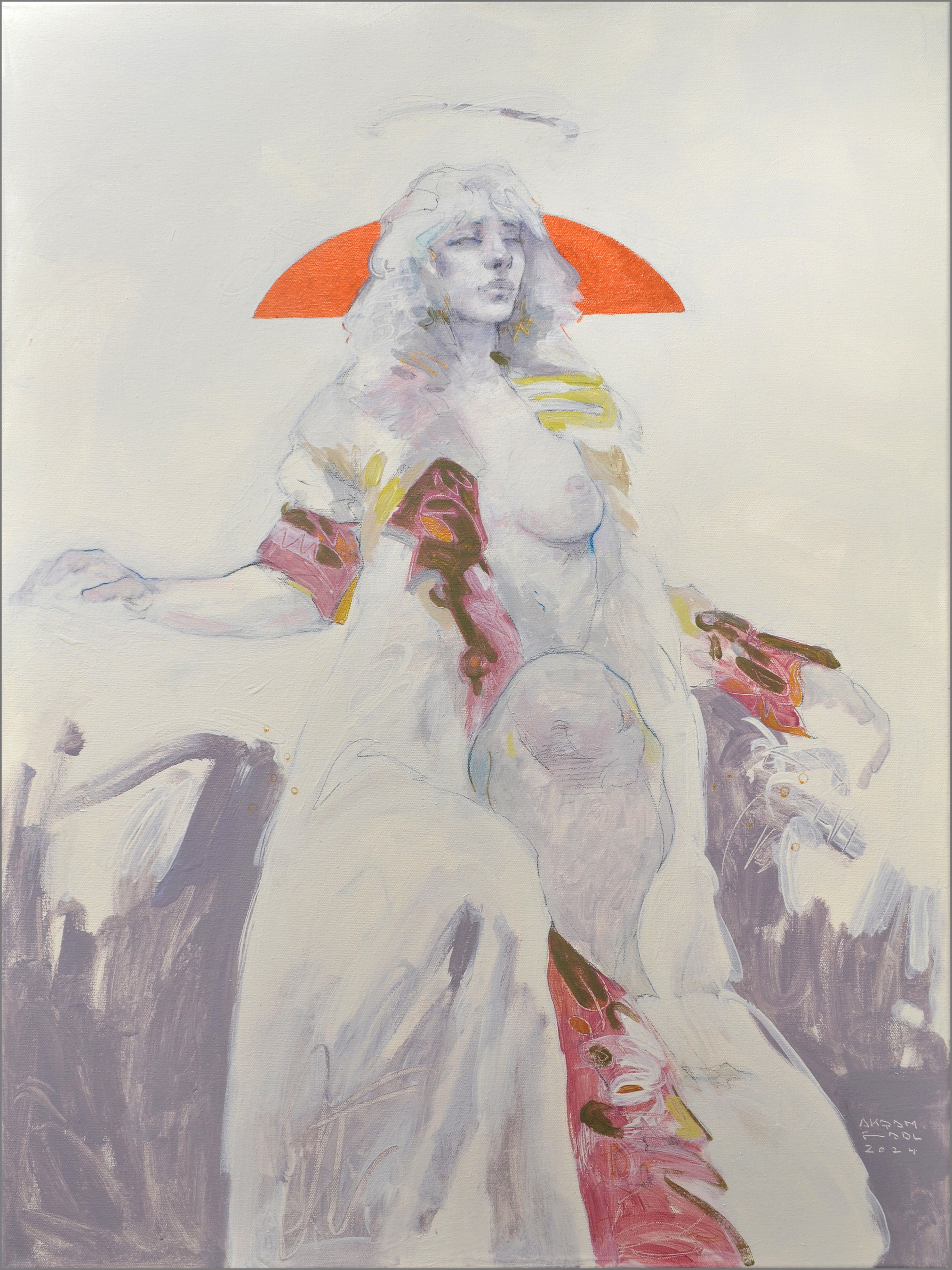 This painting weaves together elements of ethereal beauty and layered emotion in mixed media on canvas.